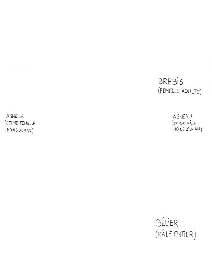 Famille animale à la base des sociétés de subsistance, petit bétail, à hauteur de taille. Un mouton est un mâle adulte castré et « moutons » au pluriel est le terme générique qui désigne tout à la fois mâles, femelles, adultes, jeunes sans les précisions suivantes et nécessaires à la lecture de cet ouvrage. Le bélier est un mâle adulte entier (non castré). La brebis est la femelle adulte.