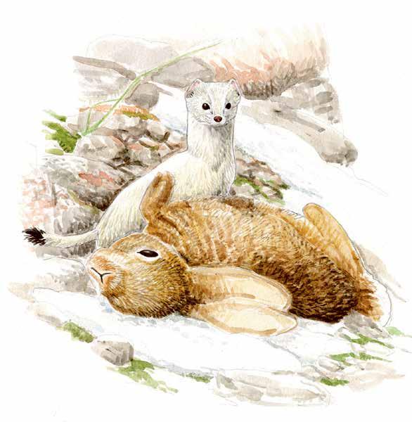 Ne vous fiez pas aux apparences ! Moi, l’hermine, grande comme une feuille de papier (sans la queue), plus légère qu’une colombe, toute mignonne dans ma blanche robe hivernale rehaussée d’une pointe de noir au bout de la queue, eh bien, je suis une prédatrice particulièrement efficace ! Je suis en effet capable de m’en prendre à des proies cinq fois plus grosses que moi, des lapins par exemple, et ne croyez pas que ce soit occasionnel ou par chance ! Dans certaines régions, ces animaux bondissants sont ma nourriture principale. Vive et véloce, je les surprends dans les prés ou dans leur terrier, et je les tue d’une morsure à la nuque.