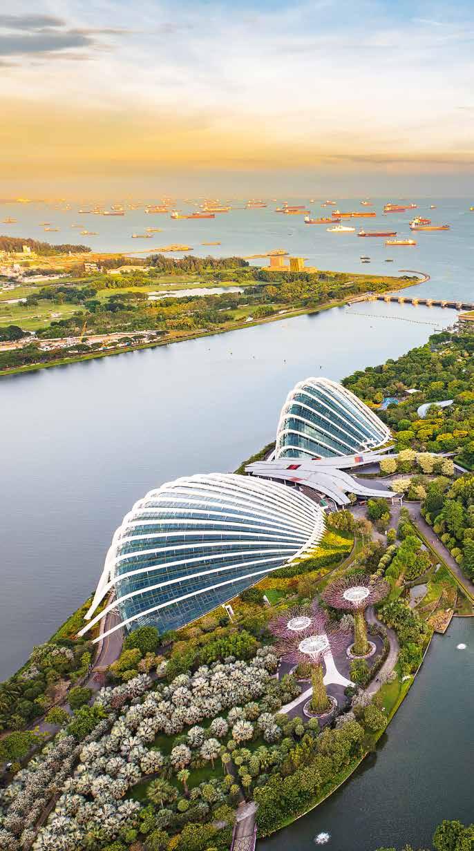 L’une des attractions les plus célèbres de Singapour, Gardens by the Bay, est un parc naturel et jardin botanique de 101 ha situé au cœur de la ville. Les jardins présentent le règne végétal de manière immersive et stimulante, tout en mettant en œuvre des procédés économes en énergie et en eau. Le parc comprend trois zones distinctes : Bay South, Bay East et Bay Central. Bay South est célèbre pour ses serres climatisées et ses emblématiques ‘Supertree’ de 50 m de haut (conçues par le cabinet Grant Associates, au Royaume-Uni), qui récoltent l’énergie solaire pour l’éclairage grâce à leur canopée. Plusieurs centaines de palétuviers plantés dans les Dragonfly Lakes (« lacs aux libellules ») et les Kingfisher Wetlands (« marais aux martinspêcheurs ») fonctionnent comme des puits de carbone en stockant les gaz à effet de serre. Voir pp. 204-207.