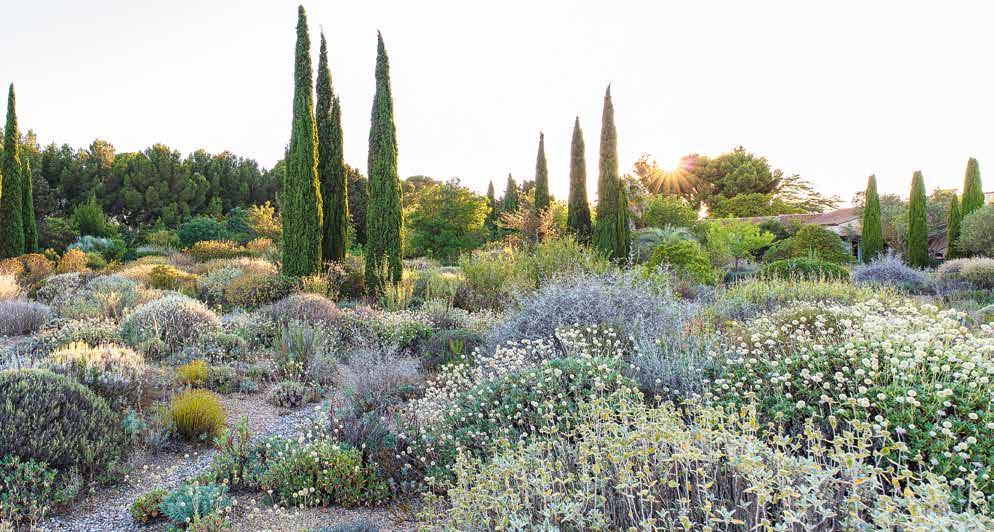 Sur la côte de la région Occitanie, non loin de Montpellier, se trouve le Jardin sec, un jardin expérimental exceptionnellement riche balayé par les vents, accompagné d’une pépinière de plantes méditerranéennes. Tous deux ont été créés par Olivier Filippi et son épouse Clara. L’ensemble est situé sur le rivage, en surplomb des lagunes, des fermes ostréicoles et de leur domicile. Là, ils testent et présentent des espèces sauvages résilientes et résistantes à la sécheresse, qu’ils ont collectées au fil des ans durant leurs voyages. Le climat y est rude, avec des étés brûlants, des périodes prolongées sans précipitations, et des hivers frais et humides. Ce climat extrême, combiné au sol argileux sousjacent, crée, aux yeux de beaucoup, une situation exigeante, voire presque impossible, pour un jardin. Olivier et Clara ont beaucoup voyagé durant plus de 30 ans, étudiant les habitats et la flore de divers paysages méditerranéens, tentant de comprendre comment les plantes s’étaient adaptées pour survivre à ces conditions des plus hostiles. Ces recherches ont nourri leur sélection d’espèces à la fois résilientes et visuellement attrayantes pour le jardin et pour la pépinière, offrant des solutions adaptées aux climats méditerranéens. Olivier est également un auteur prolifique, et a publié plusieurs ouvrages sur la création de jardins secs employant des espèces robustes.