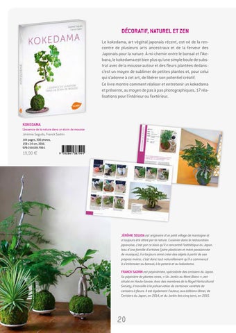 JÉRÉMIE SEGUDA est originaire d’un petit village de montagne et a toujours été attiré par la nature. Cuisinier dans la restauration japonaise, c’est par ce biais qu’il a rencontré l’esthétique du Japon. Issu d’une famille d’artistes (père plasticien et mère passionnée de musique), il a toujours aimé créer des objets à partir de ses propres mains ; c’est donc tout naturellement qu’il a commencé à s’intéresser au bonsaï, à la poterie et au kokedama. FRANCK SADRIN est pépiniériste, spécialiste des cerisiers du Japon. Sa pépinière de plantes rares, « Un Jardin au Mont-Blanc », est située en Haute-Savoie. Avec des membres de la Royal Horticultural Society, il travaille à la préservation de certaines variétés de cerisiers à fleurs. Il est également l’auteur, aux éditions Ulmer, de Cerisiers du Japon, en 2014, et du Jardin des cinq sens, en 2015.