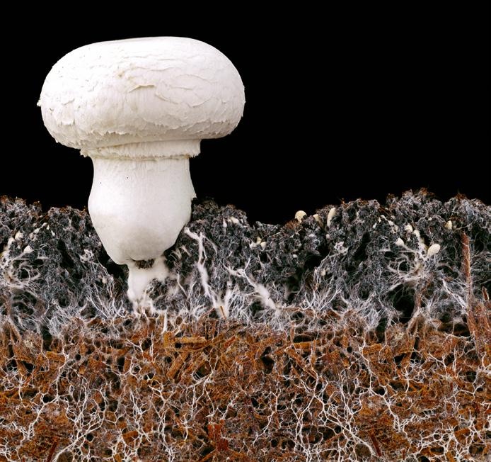 Ce que l’on appelle communément le champignon est en réalité uniquement l’organe reproducteur de l’organisme complet. Il n’apparaît que lorsque le champignon arrive à la fin de son cycle et cherche à disséminer ses spores pour se reproduire. La majeure partie de sa vie, le champignon se développe dans l’ombre sous forme de mycélium, un immense réseau de filaments qui parcourt le sol. On pourrait dire que le mycélium est l’internet de la terre, en constante évolution et réagissant à son environnement. Les mycéliums sont capables de transmettre des signaux électriques, donc des informations,