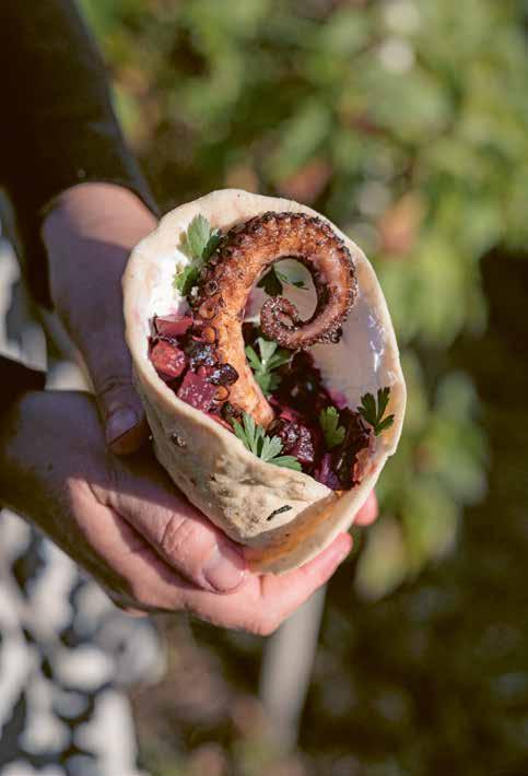 Au moment de servir Étaler le labneh dans le pita, rouler en cornet. Garnir du poulpe et de la salade.