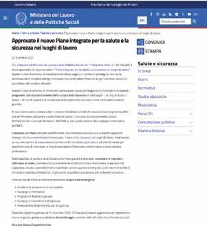 Con il decreto del ministro del Lavoro e delle Politiche sociali del 17 dicembre 2024, n. 195 è stato approvato per la prima volta il “Piano integrato per la salute e la sicurezza nei luoghi di lavoro”. Questo nuovo strumento - operativo dal primo gennaio al 31 dicembre 2025, potrà essere aggiornato per rispondere a nuove esigenze, grazie a un sistema di monitoraggio costante delle attività e di veri ca dei risultati - segna un cambio di paradigma: non più la sicurezza come semplice obbligo normativo, ma come valore fondante in ogni contesto, dalla vita quotidiana, allo studio e al lavoro. Questo nuovo strumento, di immediata applicazione, nasce dall’esigenza di promozione di azioni e programmi utili al potenziamento della cultura della sicurezza in tutti luoghi – di vita, di studio e lavoro – al ne di superare la concezione della tutela della sicurezza come mero