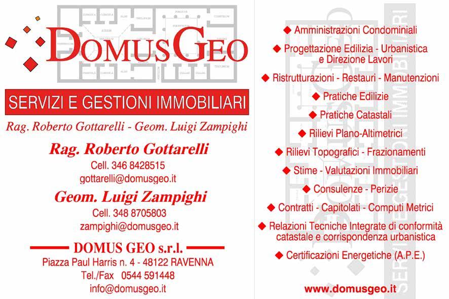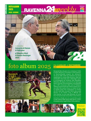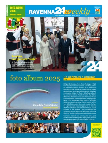 Questo periodico è aperto a quanti desiderino manifestare il loro pensiero, senza recare pregiudizio ad altri, ai sensi dell’art. 21 della Costituzione e, pertanto, la sua Redazione è disposta a ricevere testi scritti, fotografie, immagini ed altro materiale dai lettori. Tuttavia, l’eventuale pubblicazione, anche in via telematica, di quanto inviato alla Redazione di questo periodico, è a totale discrezione della Redazione medesima. In ogni caso l’eventuale pubblicazione non determina la costituzione di alcun rapporto di collaborazione dei lettori con la stessa Redazione e/o con l’Editore, né obbligo di pagamento di alcun importo da parte della Redazione e/o dell’Editore del periodico. L’invio del materiale è a titolo gratuito. Quanto inviato alla Redazione, anche se non pubblicato, non verrà restituito al mittente. Per l’invio del materiale l’indirizzo è: redazione@ravenna24ore.it È vietata la riproduzione totale o parziale di foto, marchi e testi. Copyright, tutti i diritti riservati ad Edit Italia Srl.. www.Ravenna24ore.it Weekly - settimanale di fotocronaca • Direttore editoriale: Carlo Serafini • Direttore responsabile: Marco Montruccoli Testata registrata presso il Tribunale di Ravenna al n. 1367 del Registro della Stampa in data 02/o9/2010 Stampa: CSQ (BS) Editore: Edit Italia Srl.