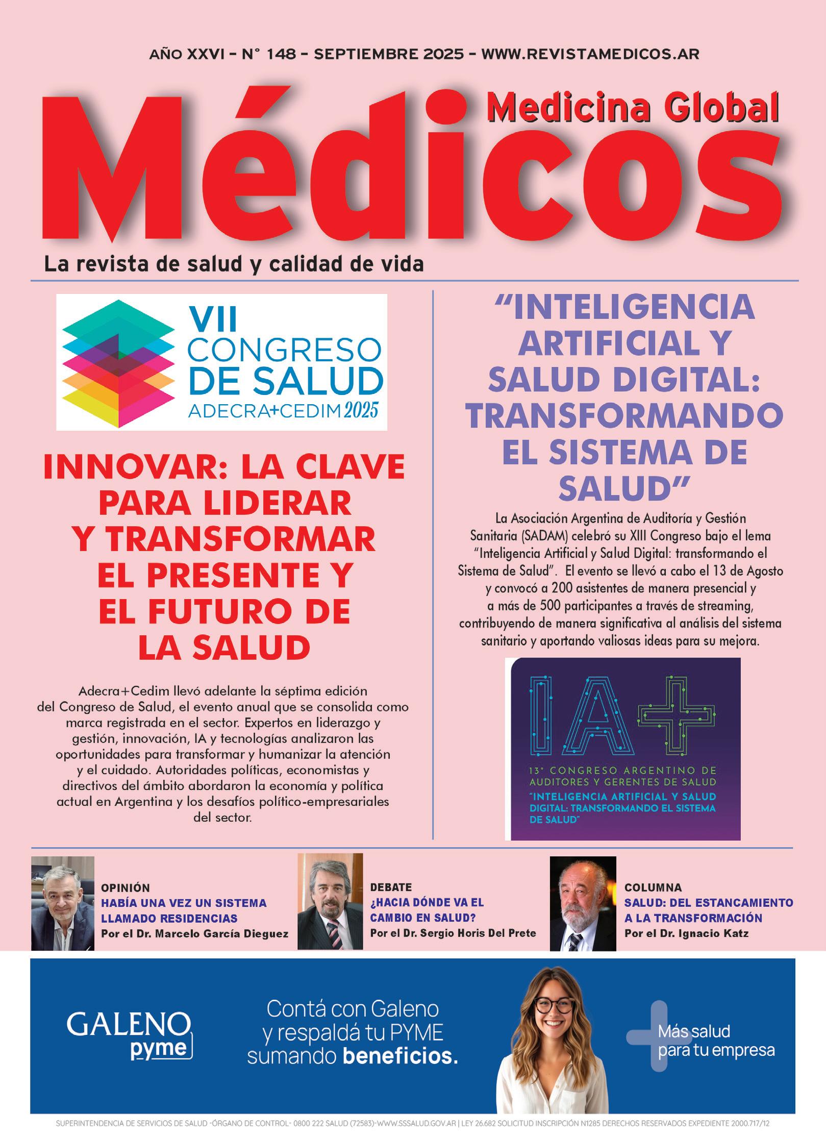 La revista Médicos Medicina Global es propiedad de Editorial Médicos S.R.L. Marca registrada Nº 1.775.400. Registro de la propiedad intelectual Nº 914.339. ISSN: 1514-500X. Todos los derechos reservados. Prohibida su reproducción parcial o total sin autorización previa de los editores. Los informes, opiniones editoriales o científicas que se reproducen son exclusivamente responsabilidad de sus autores, en ningún caso de esta publicación y tampoco del editor. Circula por suscripción. Impresión: Espacio Gráfico SRL. - Virrey Liniers 2203 - CABA.