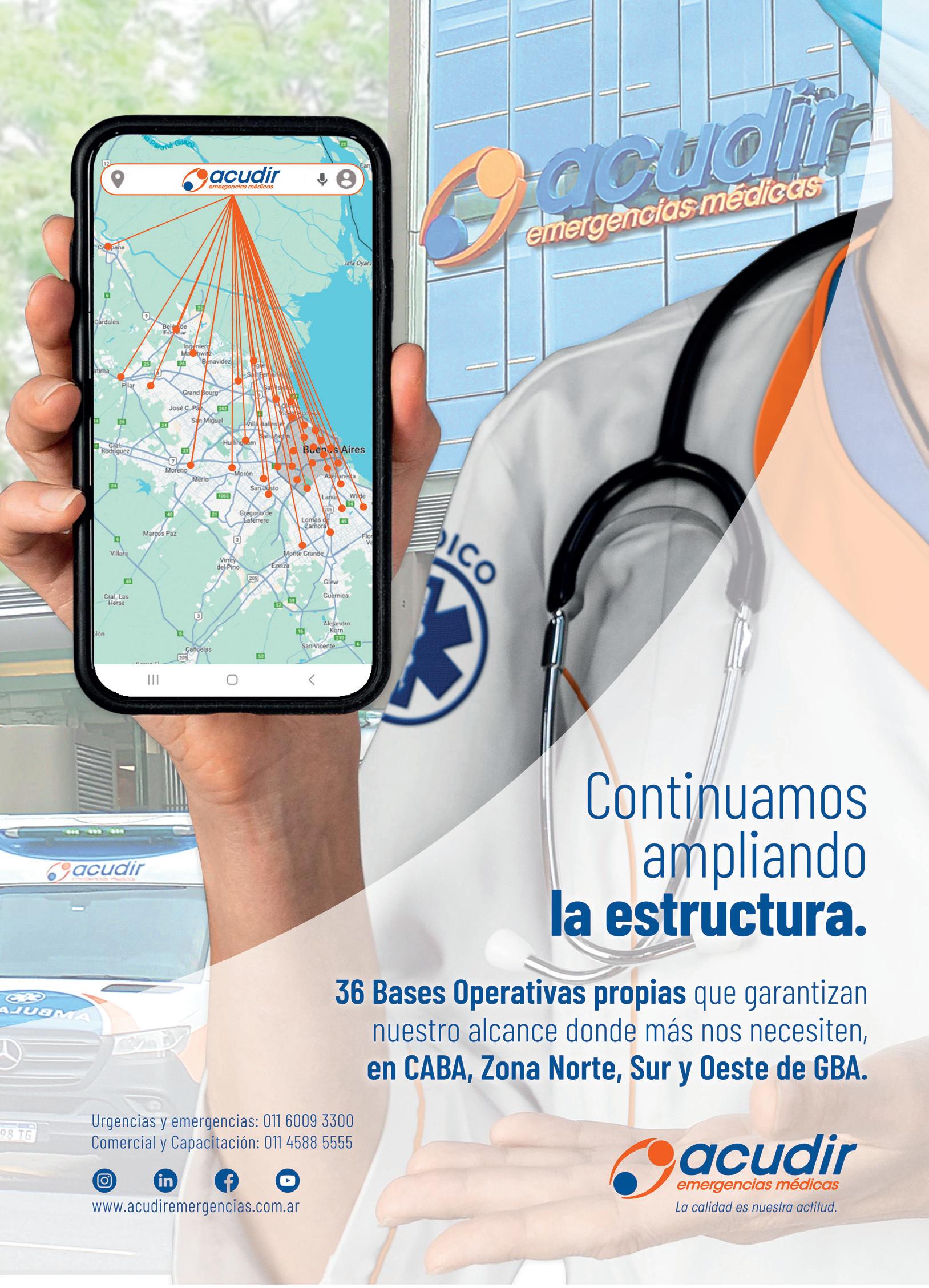 La combinación de un sistema de gestión certificado, una estructura operativa sólida con 36 Bases Operativas propias en CABA y GBA, y un equipo humano en constante capacitación reafirma el compromiso de Acudir con la excelencia en la medicina prehospitalaria. Estos logros no sólo fortalecen la confianza de clientes y pacientes, sino que también consolidan la posición de la empresa como un actor de referencia en el Sistema de Salud, innovando y trabajando para superar los desafíos que plantea la atención en contextos de urgencia y emergencia. n