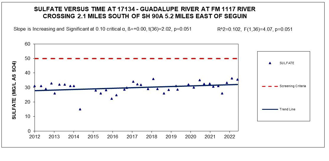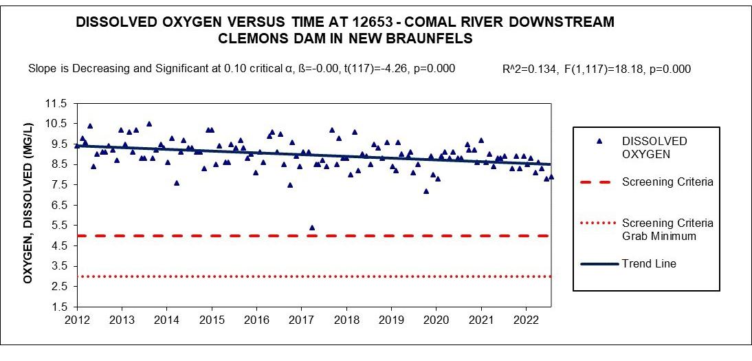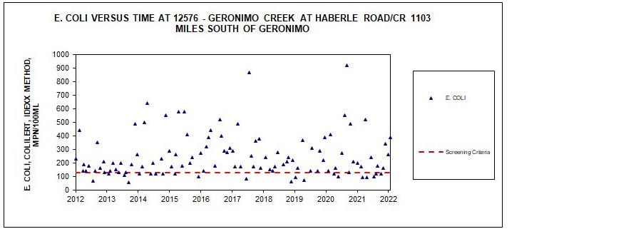 Elm Creek is monitored quarterly by GBRA at station 17894, but data at this station were not analyzed for trends because the period of record for this site is too short to produce trends. Station 17894 was added in 2020 to confirm the impairment for dissolved oxygen. Elm Creek has been listed on the 303(d) List of Impaired Water Bodies since 1999 for depressed dissolved oxygen levels and for bacteria since 2002.
