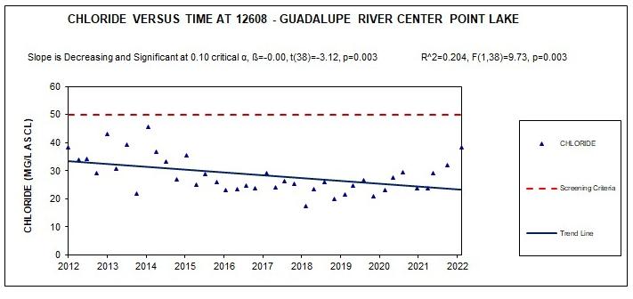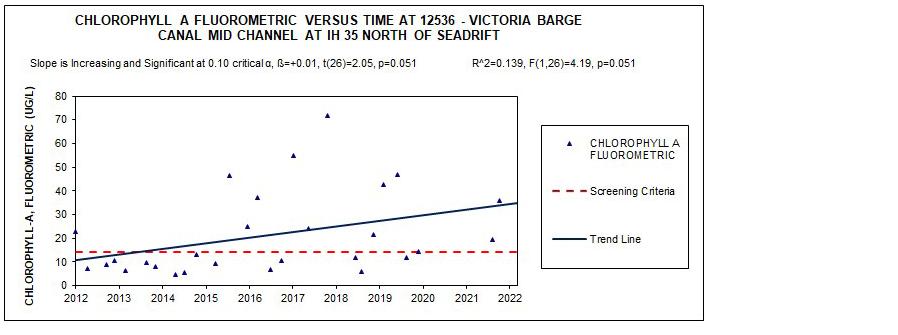 Trend analyses performed on data from this segment show an increasing trend for chloride (Figure 45), and grab samples collected in 2021 exceeded the screening criteria for chloride for the first time during the reported period. This segment receives considerable inflow from the San Antonio River, which could be a contributing factor to this increase. Another potential contributor to the increase in chlorides could be saltwater intrusion.
