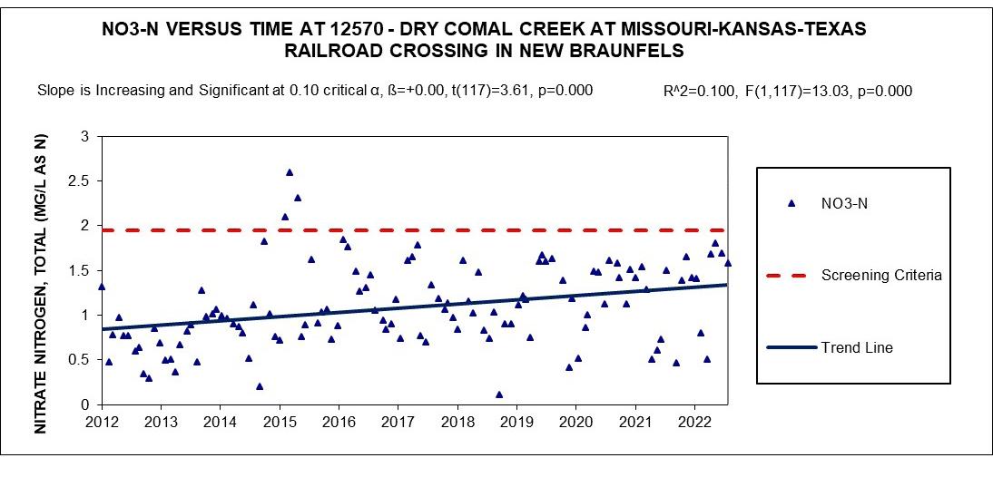 Though still below the screening level, analyses showed increasing trends for nitrate-nitrogen at all three stations in this segment. Data from station 20470 is shown here (Figure 46). Increased non-point source pollution from agriculture in the surrounding watershed could be a contributing factor.