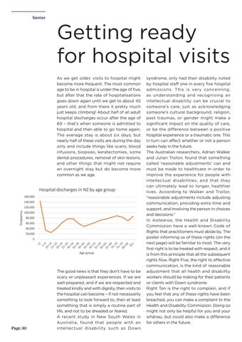 syndrome, only had their disability noted by hospital staff one in every five hospital admissions. This is very concerning, as understanding and recognising an intellectual disability can be crucial to someone’s care, just as acknowledging someone’s cultural background, religion, past traumas, or gender might make a significant impact on the quality of care, or be the difference between a positive hospital experience or a traumatic one. This in turn can affect whether or not a person seeks help in the future. The Australian researchers, Adrian Walker and Julian Trollor, found that something called ‘reasonable adjustments’ can and must be made to healthcare in order to improve the experience for people with intellectual disabilities, and that they can ultimately lead to longer, healthier lives. According to Walker and Trollor, “reasonable adjustments include adjusting communication, providing extra time and support, and involving the person in choices and decisions.” In Aotearoa, the Health and Disability Commission have a well-known Code of Rights that practitioners must abide by. The poster informing us of these rights (on the next page) will be familiar to most. The very first right is to be treated with respect, and it is from this principle that all the subsequent rights flow. Right Five, the right to effective communication, is the kind of reasonable adjustment that all health and disability workers should be making for their patients or clients with Down syndrome. Right Ten is the right to complain, and if you feel that any of these rights have been breached, you can make a complaint to the Health and Disability Commission. Doing so might not only be helpful for you and your whānau, but could also make a difference for others in the future.