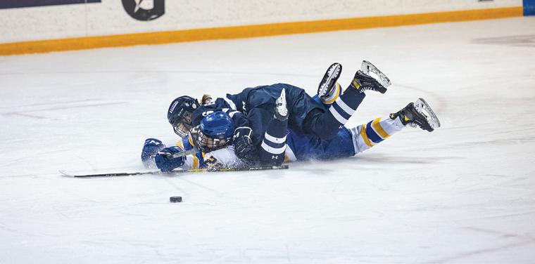The squad led for the majority of the game but couldn’t hold off the strong Varsity Blues team, resulting in a 2-1 loss at Varsity Arena. Diving for the puck, senior Madison Lalonde was met with a crash from a Varsity Blues player.