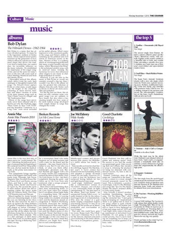 While this track may be the oldest from Darkstar’s just released debut album North, ‘Aidy’s Girl’s a Computer’ remains a remarkably fresh take on GXEVWHS D VPDUW UHĂ€ QHG PL[ RI JDUDJH beats and unquestionably the album’s high point. 4. Warpaint – Undertow New Single 7KH Ă€ UVW VLQJOH IURP WKH PXFK K\SHG American psych-rock band’s record The Fool 8QGHUWRZ Ă€ QGV DQ LQIHFWLRXV VSRW between Sixouxie & The Banshees and latter-day Sonic Youth, and refuses to be released from your consciousness. 5. The Vaccines – Wrecking Ball/Blow It Up Streaming Singles &XUUHQW 10( GDUOLQJV 7KH 9DFFLQHV Ă€ nally release their debut double A-side single ‘Wrecking Ball’/’Blow It Up’ on November 22. While it’s hard to see if LW¡V DOO MXVWLĂ€ HG \HW Âś:UHFNLQJ %DOO¡ LV D blink-and-you’ll-miss-it slice of Vaselines-indebted noise, while ‘Blow It Up’ goes for a slower, surf-rock feel. Expect them to be very big, very quickly. Watch and listen to the whole Top 5 at www.thecourieronline.co.uk Mark Corcoran-Lettice