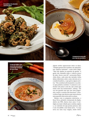 alguns atritos apareceram entre as duas. “Sempre gostava de cozinhar, de caprichar, isso ajudava bastante”, conta dona Dêga. “Mas não ajudou na questão da gestão. A gente não entendia nada e cobrava preço de mãe, ficava com dó”, acrescenta Mara. Além disso, cada uma das metades tinha ideias diferentes sobre como deveria ser a comida brasileira, o que gerou alguns atritos. “Ela cozinhava divinamente e eu achava que poderia cozinhar. E comecei a confrontar um pouco com ela, das coisas que tinha visto em restaurantes”, afirma. “De vez em quando tem que sair uma briguinha, senão a cozinha não funciona!”, brinca dona Dega, que destaca que nunca houve uma questão mais séria entre as duas. Mesmo com os pequenos entreveros, o Roça Nova, primeiro restaurante da dupla, aberto em 1985, durou cinco anos. O cardápio era mais voltado para cozinha caipira e, ao contrário do que posssa parecer, não é um trocadilho com bossa-nova. “A roça nova era uma roça virgem, muito fértil.