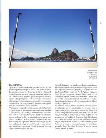 CIDADE ERÓTICA Opina o crítico Paulo Herkenhoff que o Pão de Açúcar é um problema pictórico antigo da cidade – de Taunay a Tarsila do Amaral, passando por Thimóteo da Costa e Guignard. Entende-se que é problema porque é assunto de relevância; um fato-estético da geografia que exerce grande poder de atração sobre quem passa por ali ou sobre ele ouve falar. Se o Rio de Janeiro é mundialmente conhecido como um destino erótico, o Pão de Açúcar entra como fator importante para essa consideração, coloca o artista. “Para mim, ele sempre foi um aliado, uma solução”, garante. O grande ícone já protagonizara um clássico de sua obra, “Eu Só Vendo a Vista” (1998) – para Herkenhoff o trabalho mais político de Marcos Chaves, “que aborda o colonialismo interno no País e no Rio em sua resistência ao capital imobiliário”. Depois, o Pão de Açúcar foi a imagem de abertura do vídeo Day and Nightshots (Oferta e Procura) (2015), exibido em Destricted.br, projeto coletivo sobre sexo, erotismo e pornografia, apresentado no Festival do Rio, em 2010, e n Galpão Fortes Vilaça, SP, em 2011.
