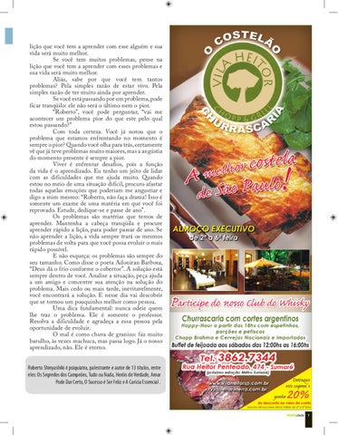 lição que você tem a aprender com esse alguém e sua vida será muito melhor. Se você tem muitos problemas, pense na lição que você tem a aprender com esses problemas e sua vida será muito melhor. Aliás, sabe por que você tem tantos problemas? Pela simples razão de estar vivo. Pela simples razão de ter muito ainda por aprender. Se você está passando por um problema, pode ficar tranqüilo: ele não será o último nem o pior. “Roberto”, você pode perguntar, “vai me acontecer um problema pior do que este pelo qual estou passando?” Com toda certeza. Você já notou que o problema que estamos enfrentando no momento é sempre o pior? Quando você olha para trás, certamente vê que já teve problemas muito maiores, mas a angústia do momento presente é sempre a pior. Viver é enfrentar desafios, pois a função da vida é o aprendizado. Eu tenho um jeito de lidar com as dificuldades que me ajuda muito. Quando estou no meio de uma situação difícil, procuro afastar todas aquelas emoções que poderiam me angustiar e digo a mim mesmo: “Roberto, não faça drama! Isso é somente um exame de uma matéria em que você foi reprovado. Estude, dedique-se e passe de ano”. Os problemas são matérias que temos de aprender. Mantenha a cabeça tranqüila e procure aprender rápido a lição, para poder passar de ano. Se não aprender a lição, a vida sempre trará os mesmos problemas de volta para que você possa evoluir o mais rápido possível. E não esqueça: os problemas são sempre do seu tamanho. Como disse o poeta Adoniran Barbosa, “Deus dá o frio conforme o cobertor”. A solução está sempre dentro de você. Analise a situação, peça ajuda a um amigo e concentre sua atenção na solução do problema. Mais cedo ou mais tarde, inevitavelmente, você encontrará a solução. E nesse dia vai descobrir que se tornou um pouquinho melhor como pessoa. Uma dica fundamental: nunca odeie quem lhe traz o problema. Ele é somente o professor. Resolva a dificuldade e agradeça a essa pessoa pela oportunidade de evoluir. O mal é como chuva de granizo: faz muito barulho, às vezes machuca, mas passa logo. Já o nosso aprendizado, não. Ele é eterno. Roberto Shinyashiki é psiquiatra, palestrante e autor de 13 títulos, entre eles: Os Segredos dos Campeões, Tudo ou Nada, Heróis de Verdade, Amar Pode Dar Certo, O Sucesso é Ser Feliz e A Carícia Essencial .