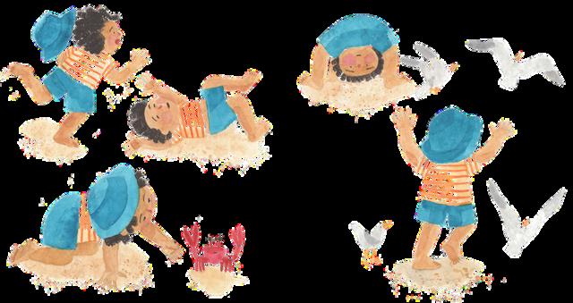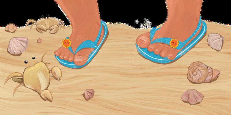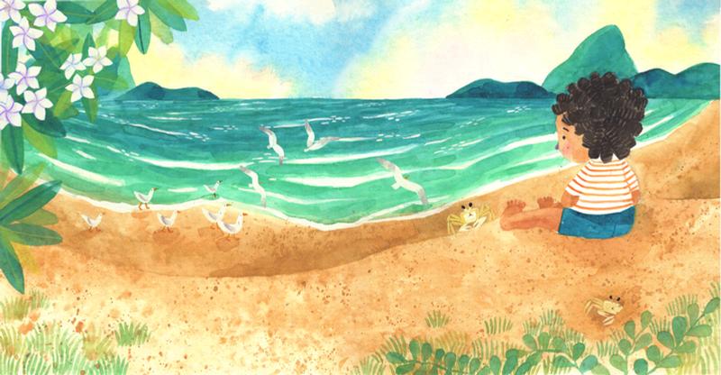 Em “Na praia”, o bebê leitor é convidado a acompanhar um passeio cheio de descobertas pelas paisagens do litoral. Passo a passo, os pequenos pés caminham pela areia, atravessam a vegetação da restinga, observam flores,borboletaseformigas,encontramconchasesiris e,porfim,chegamaoencontrotãoesperadocomomar esuasondas