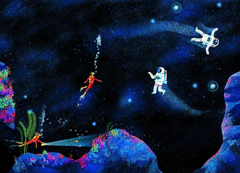 o fundo do mar e o azul profundo do espaço em uma narrativa visual des-lum-bran-te