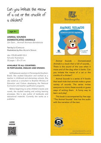 ANIMAL SOUNDS DOMESTICATED ANIMALS Um Som... Animal! Animais domésticos Text by L ô C arvalho Illustrations by A na A lzueta S igaud isbn 978-85-66587-55-5 full-color illustrations 32 pages I 25 x 21 cm AVAILABLE TO ALL COUNTRIES. IN PORTUGUESE, ENGLISH AND SPANISH.