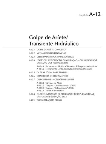 Golpe de Aríete/ Transiente Hidráulico A-12.1 GOLPE DE ARÍETE. CONCEITO A-12.2 MECANISMO DO FENÔMENO A-12.3 CELERIDADE (VELOCIDADE ACÚSTICA) A-12.4 “FASE” OU “PERÍODO” DA CANALIZAÇÃO – CLASSIFICAÇÃO E DURAÇÃO DOS FECHAMENTOS