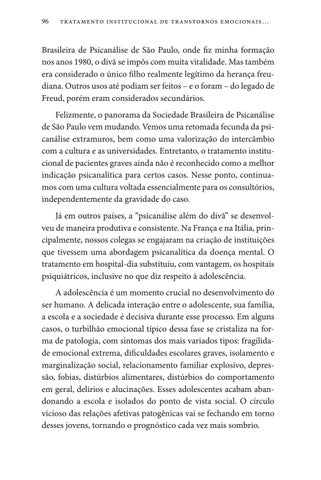 Brasileira de Psicanálise de São Paulo, onde fiz minha formação nos anos 1980, o divã se impôs com muita vitalidade. Mas também era considerado o único filho realmente legítimo da herança freudiana. Outros usos até podiam ser feitos – e o foram – do legado de Freud, porém eram considerados secundários. Felizmente, o panorama da Sociedade Brasileira de Psicanálise de São Paulo vem mudando. Vemos uma retomada fecunda da psicanálise extramuros, bem como uma valorização do intercâmbio com a cultura e as universidades. Entretanto, o tratamento institucional de pacientes graves ainda não é reconhecido como a melhor indicação psicanalítica para certos casos. Nesse ponto, continuamos com uma cultura voltada essencialmente para os consultórios, independentemente da gravidade do caso. Já em outros países, a “psicanálise além do divã” se desenvolveu de maneira produtiva e consistente. Na França e na Itália, principalmente, nossos colegas se engajaram na criação de instituições que tivessem uma abordagem psicanalítica da doença mental. O tratamento em hospital-dia substituiu, com vantagem, os hospitais psiquiátricos, inclusive no que diz respeito à adolescência. A adolescência é um momento crucial no desenvolvimento do ser humano. A delicada interação entre o adolescente, sua família, a escola e a sociedade é decisiva durante esse processo. Em alguns casos, o turbilhão emocional típico dessa fase se cristaliza na forma de patologia, com sintomas dos mais variados tipos: fragilidade emocional extrema, dificuldades escolares graves, isolamento e marginalização social, relacionamento familiar explosivo, depressão, fobias, distúrbios alimentares, distúrbios do comportamento em geral, delírios e alucinações. Esses adolescentes acabam abandonando a escola e isolados do ponto de vista social. O círculo vicioso das relações afetivas patogênicas vai se fechando em torno desses jovens, tornando o prognóstico cada vez mais sombrio.