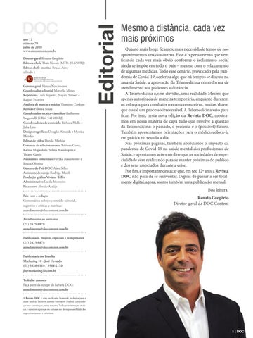 Mesmo a distância, cada vez mais próximos Quanto mais longe ficamos, mais necessidade temos de nos aproximarmos uns dos outros. Esse é o pensamento que vem ficando cada vez mais óbvio conforme o isolamento social ainda se impõe em todo o país – mesmo com o relaxamento de algumas medidas. Todo esse cenário, provocado pela pandemia de Covid-19, acelerou algo que há tempos se discute na área da Saúde: a aprovação da Telemedicina como forma de atendimento aos pacientes a distância. A Telemedicina é, sem dúvidas, uma realidade. Mesmo que apenas autorizada de maneira temporária, enquanto durarem os esforços para combater o novo coronavírus, muitos dizem que esse é um processo irreversível. A Telemedicina veio para ficar. Por isso, nesta nova edição da Revista DOC, mostramos em nossa matéria de capa tudo que envolve a questão da Telemedicina: o passado, o presente e o (possível) futuro. Também apresentamos orientações para o médico colocá-la em prática no seu dia a dia. Nas próximas páginas, também abordamos o impacto da pandemia de Covid-19 na saúde mental dos profissionais de Saúde, e apontamos ações on-line que as sociedades de especialidade vêm realizando para se manter próximas do público e dos seus associados durante a crise. Por fim, é importante destacar que, em seu 12º ano, a Revista DOC não para de se reinventar. Depois de passar a ser totalmente digital, agora, somos também uma publicação mensal. Boa leitura! Renato Gregório Diretor-geral da DOC Content
