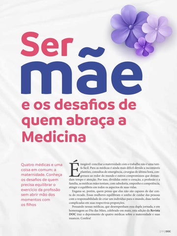 inegável: conciliar a maternidade com o trabalho não é uma tarefa fácil. Para as médicas é ainda mais difícil devido a incontáveis plantões, consultas de emergência, cirurgias de última hora, congressos ao redor do mundo e outros compromissos que demandam tempo e atenção. Por isso, divididas entre o coração, a profissão e a família, as médicas mães tentam, com sabedoria, empenho e competência, atingir o equilíbrio em todos os aspectos de suas vidas. Engana-se, porém, quem pensa que elas não são capazes de dar conta do recado. Essas mulheres equilibram o sonho de cuidar das pessoas com a responsabilidade de criar um indivíduo para o mundo, duas tarefas complicadas em suas respectivas proporções. Pensando nessas médicas, que desempenham essa dupla jornada, e em homenagem ao Dia das Mães, celebrado em maio, esta edição da Revista DOC traz o depoimento de quatro médicas sobre a maternidade e suas nuances. Confira!