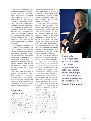Expansão profissional Um ano depois, Domingues conheceu o empresário José Isaac Peres, fundador e presidente da Multiplan, responsável por uma rede de shoppings espalhados por todo o país. O encontro resultou no convite para o radiologista abrir uma clínica de diagnósticos por imagem em um desses shoppings.