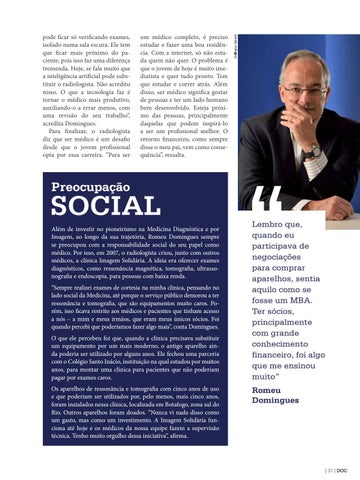 SOCIAL Além de investir no pioneirismo na Medicina Diagnóstica e por Imagem, ao longo da sua trajetória, Romeu Domingues sempre se preocupou com a responsabilidade social do seu papel como médico. Por isso, em 2007, o radiologista criou, junto com outros médicos, a clínica Imagem Solidária. A ideia era oferecer exames diagnósticos, como ressonância magnética, tomografia, ultrassonografia e endoscopia, para pessoas com baixa renda. “Sempre realizei exames de cortesia na minha clínica, pensando no lado social da Medicina, até porque o serviço público demorou a ter ressonância e tomografia, que são equipamentos muito caros. Porém, isso ficava restrito aos médicos e pacientes que tinham acesso a nós – a mim e meus irmãos, que eram meus únicos sócios. Foi quando percebi que poderíamos fazer algo mais”, conta Domingues. O que ele percebeu foi que, quando a clínica precisava substituir um equipamento por um mais moderno, o antigo aparelho ainda poderia ser utilizado por alguns anos. Ele fechou uma parceria com o Colégio Santo Inácio, instituição na qual estudou por muitos anos, para montar uma clínica para pacientes que não poderiam pagar por exames caros. Os aparelhos de ressonância e tomografia com cinco anos de uso e que poderiam ser utilizados por, pelo menos, mais cinco anos, foram instalados nessa clínica, localizada em Botafogo, zona sul do Rio. Outros aparelhos foram doados. “Nunca vi nada disso como um gasto, mas como um investimento. A Imagem Solidária funciona até hoje e os médicos da nossa equipe fazem a supervisão técnica. Tenho muito orgulho dessa iniciativa”, afirma.