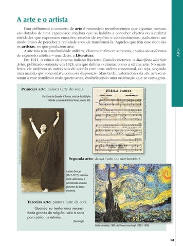 Para definirmos o conceito de arte é necessário reconhecermos que algumas pessoas são dotadas de uma capacidade criadora que as habilita a conceber objetos ou a realizar atividades que expressam emoções, estados de espírito e acontecimentos, traduzindo um modo único de perceber a realidade e/ou de transformá-la. Aqueles que têm esse dom são os artistas, os que produzem arte. A arte não tem uma finalidade utilitária, ela tem um fim em si mesma, e várias são as formas de expressão artística – uma delas, a Literatura. Em 1911, o crítico de cinema italiano Ricciotto Canudo escreveu o Manifesto das Sete Artes, publicado somente em 1923, em que definia o cinema como a sétima arte. No manifesto, ele ordenou as outras seis de acordo com uma ordem consensual, ou seja, segundo uma maioria que concordava com essa disposição. Mais tarde, historiadores da arte acrescentaram a esse manifesto mais quatro artes, estabelecendo uma ordenação que se consagrou.