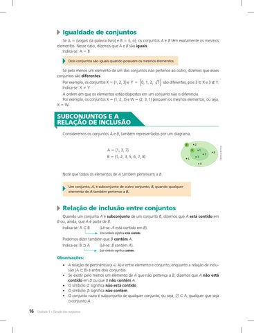 Igualdade de conjuntos Se A 5 {vogais da palavra livro} e B 5 {i, o}, os conjuntos A e B têm exatamente os mesmos elementos. Nesse caso, dizemos que A e B são iguais. Indica-se: A 5 B Dois conjuntos são iguais quando possuem os mesmos elementos.