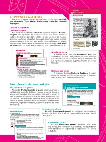 A segunda seção do capítulo, Astúcias do texto, tem como foco a leitura e a compreensão de textos de vários gêneros: histórias em quadrinhos, charges, notícias de jornal, reportagens, resenhas e, principalmente, produções literárias.