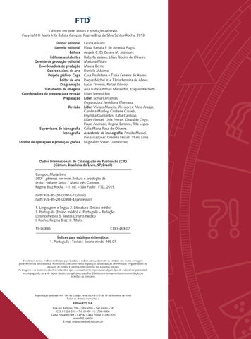 Dados Internacionais de Catalogação na Publicação (CIP) (Câmara Brasileira do Livro, SP, Brasil) Campos, Maria Inês 360º : gêneros em rede : leitura e produção de texto : volume único / Maria Inês Campos, Regina Braz Rocha. – 1. ed. – São Paulo : FTD, 2015. ISBN 978-85-20-00307-7 (aluno) ISBN 978-85-20-00308-4 (professor) 1. Linguagem e língua 2. Literatura (Ensino médio) 3. Português (Ensino médio) 4. Português – Redação (Ensino médio) 5. Textos (Ensino médio) I. Rocha, Regina Braz. II. Título. 15-03886 CDD-469.07 Índices para catálogo sistemático: 1. Português : Textos : Ensino médio 469.07