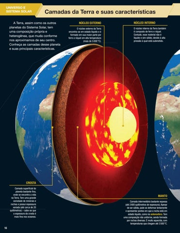 MANTO Camada intermediária bastante espessa (até 2 800 quilômetros de espessura). Apesar de ser sólida, pode se deformar lentamente e apresentar pontos em que a rocha está em estado líquido, como na astenosfera. Tem uma composição não uniforme, sendo formada por rochas diversas. É muito aquecida, com temperaturas que chegam até 3 500 °C.
