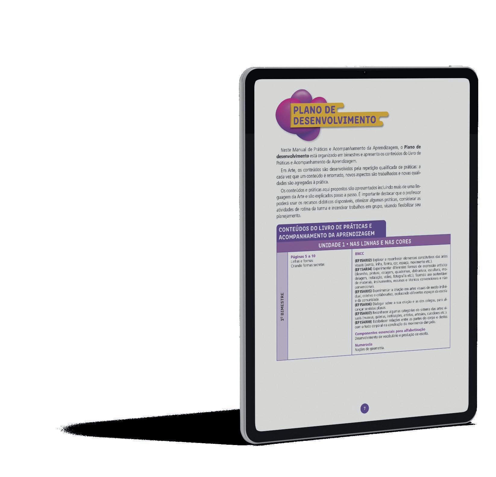 Os Manuais de Práticas e Acompanhamento da Aprendizagem (disponibilizados digitalmente em PDF) pretendem apoiar o encaminhamento pedagógico dos Livros de Práticas, composto de proposições distribuídas nas seções Para revisar e Paraampliar e organizadas em duas unidades e um projeto temático. Este material digital traz o suporte necessário para a atuação docente no Ensino da Arte nesta fase de desenvolvimento dos estudantes, em que eles conseguem se relacionar mais intensamente com as múltiplas linguagens. Ao abordar as práticas com detalhes e explicitar a perspectiva didática das atividades do Livro de Práticas, o docente consegue potencializar as experiências do estudante, oferecendo oportunidades para que faça descobertas, reflita sobre elas e amplie saberes e habilidades.