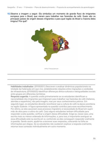 ______________________________________________________________________________________________ ______________________________________________________________________________________________ ______________________________________________________________________________________________ Habilidades trabalhadas: (EF05GE01) Descrever e analisar dinâmicas populacionais na Unidade da Federação em que vive, estabelecendo relações entre migrações e condições de infraestrutura; (EF05GE02) Identificar diferenças étnico-culturais e desigualdades sociais entre grupos em diferentes territórios Resposta sugerida: A questão avalia primeiramente se os estudantes identificam a nacionalidade dos imigrantes que imigraram para trabalhar nas fazendas de café (italianos, alemães e espanhóis), não pela imagem, mas por seus conhecimentos prévios. Em segundo lugar, os estudantes deverão reconhecer que a cultura do café na época acontecia na região Sudeste. A figura apresentada na questão contribui para esse reconhecimento. Por último, se eles associam esse processo migratório à necessidade do Brasil em suprir mão de obra para o cultivo do café. Caso alguns estudantes tenham dificuldade para responder a esta questão, verificar a origem dessa dificuldade. Exige-se, nesse caso, uma escrita mais ou menos ordenada de informações, e, para isso, é importante averiguar se essa dificuldade está na escrita em si, conferindo se eles conseguem responder oralmente à questão. Sendo assim, ajudá-los a escrever suas respostas, colocando na folha as informações por etapas. Se os estudantes não souberem explicar a resposta oralmente, retomar esse conteúdo individualmente em outro momento.
