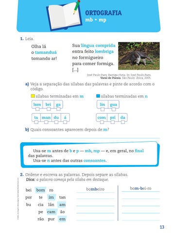 Usa-se m antes de b e p — mb, mp — e, em geral, no final das palavras. Usa-se n antes das outras consoantes. 2. Ordene e escreva as palavras. Depois separe as sílabas. Dica: a palavra começa pela sílaba em destaque.