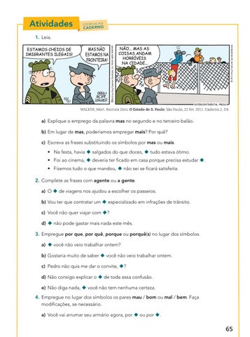 a ) Explique o emprego da palavra mas no segundo e no terceiro balão. b) Em lugar de mas, poderíamos empregar mais? Por quê? c) Escreva as frases substituindo os símbolos por mas ou mais. • Na festa, havia u salgados do que doces, u tudo estava ótimo. • Foi ao cinema, u deveria ter ficado em casa porque precisa estudar u. • Fizemos tudo o que mandou, u não sei se ficará satisfeita. 2. Complete as frases com agente ou a gente. a) O u de viagens nos ajudou a escolher os passeios. b) Vou ter que contratar um u especializado em infrações de trânsito. c) Você não quer viajar com u? d) u não pode gastar mais nada este mês. 3. Empregue por que, por quê, porque ou porquê(s) no lugar dos símbolos. a) u você não veio trabalhar ontem? b) Gostaria muito de saber u você não veio trabalhar ontem. c) Pedro não quis me dar o convite, u? d) Não consigo explicar o u de toda essa confusão. e) Não diga nada, u você não tem nenhuma certeza. 4. Empregue no lugar dos símbolos os pares mau / bom ou mal / bem. Faça modificações, se necessário. a) Você vai arrumar seu armário agora, por u ou por u.