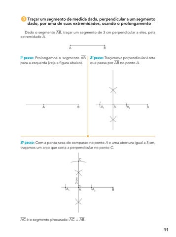 3 Traçar um segmento de medida dada, perpendicular a um segmento ● dado, por uma de suas extremidades, usando o prolongamento Dado o segmento AB, traçar um segmento de 3 cm perpendicular a eles, pela extremidade A. A