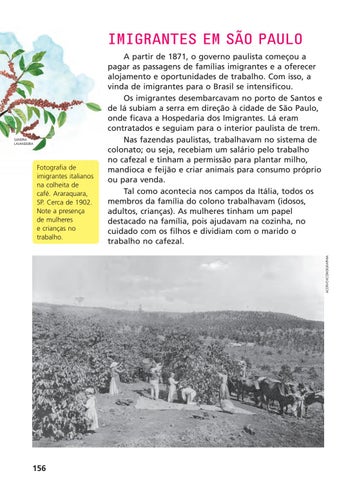 A partir de 1871, o governo paulista começou a pagar as passagens de famílias imigrantes e a oferecer alojamento e oportunidades de trabalho. Com isso, a vinda de imigrantes para o Brasil se intensificou. Os imigrantes desembarcavam no porto de Santos e de lá subiam a serra em direção à cidade de São Paulo, onde ficava a Hospedaria dos Imigrantes. Lá eram contratados e seguiam para o interior paulista de trem. Nas fazendas paulistas, trabalhavam no sistema de colonato; ou seja, recebiam um salário pelo trabalho no cafezal e tinham a permissão para plantar milho, mandioca e feijão e criar animais para consumo próprio ou para venda. Tal como acontecia nos campos da Itália, todos os membros da família do colono trabalhavam (idosos, adultos, crianças). As mulheres tinham um papel destacado na família, pois ajudavam na cozinha, no cuidado com os filhos e dividiam com o marido o trabalho no cafezal.