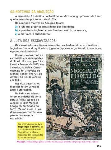Fac-símile da capa do livro Negociação e conflito, de João José Reis e Eduardo Silva. O livro analisa a resistência dos escravizados na história do Brasil. Professor, a palavra Abolição grafada com letra inicial maiúscula refere-se à extinção legal da escravidão no Brasil.