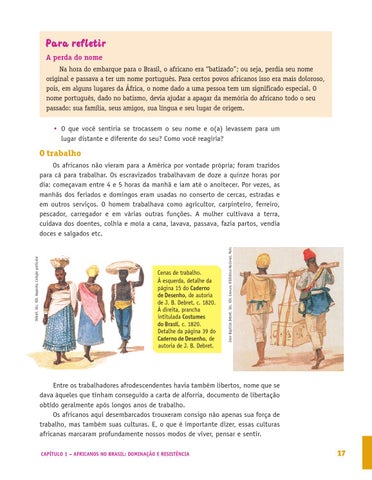 Para refletir A perda do nome Na hora do embarque para o Brasil, o africano era “batizado”; ou seja, perdia seu nome original e passava a ter um nome português. Para certos povos africanos isso era mais doloroso, pois, em alguns lugares da África, o nome dado a uma pessoa tem um significado especial. O nome português, dado no batismo, devia ajudar a apagar da memória do africano todo o seu passado: sua família, seus amigos, sua língua e seu lugar de origem. • O que você sentiria se trocassem o seu nome e o(a) levassem para um lugar distante e diferente do seu? Como você reagiria?