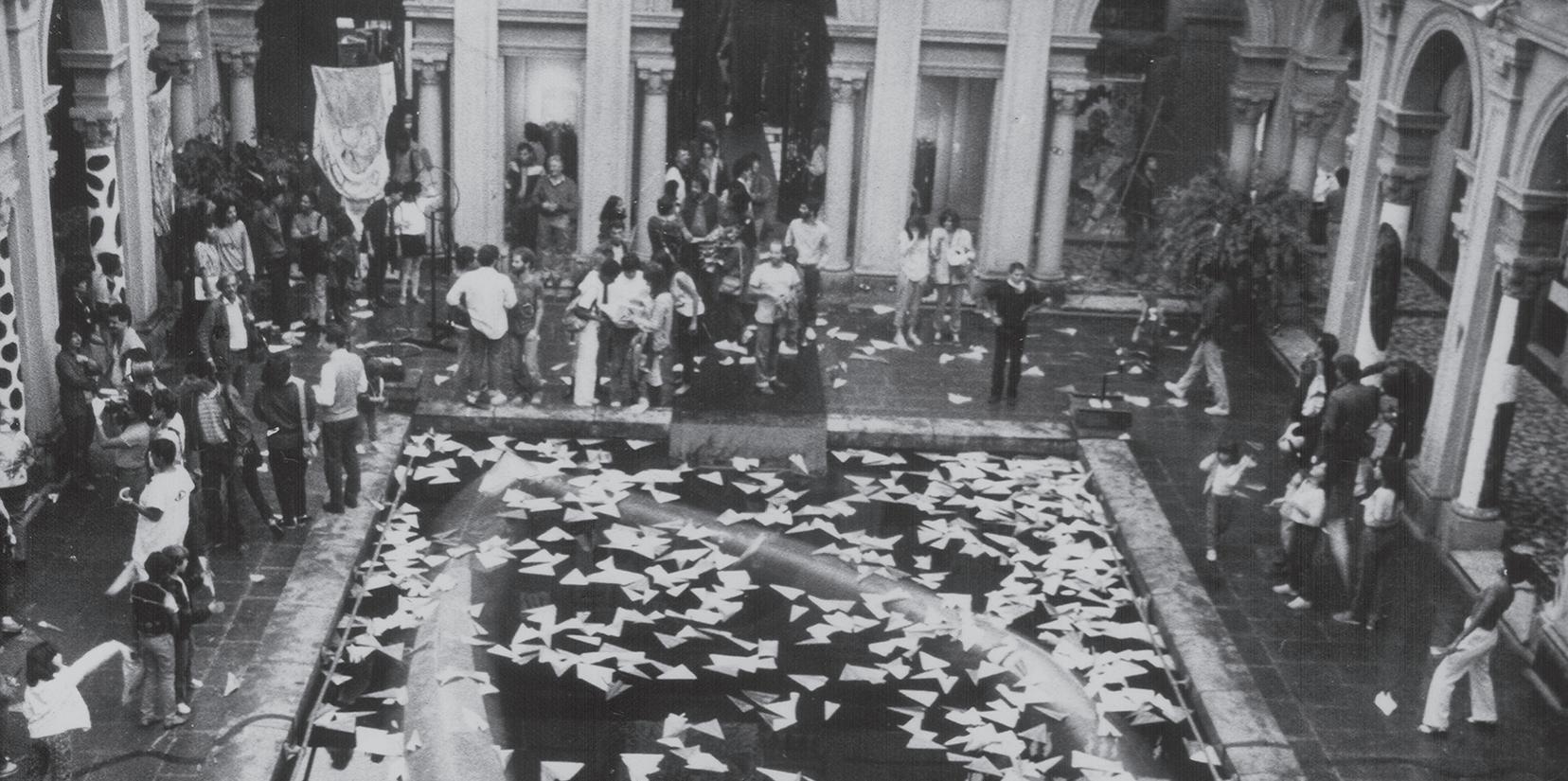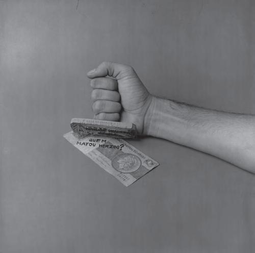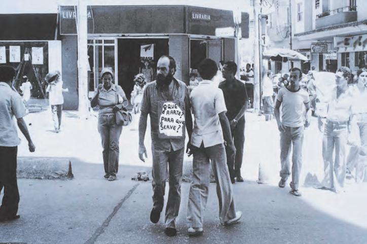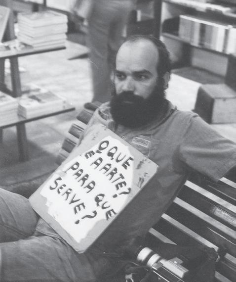 Paulo Bruscky (1949-) é um artista multimídia brasileiro. Na década de 1970, desafiou a ditadura civil-militar, realizando trabalhos questionadores e provocantes. Na performance documentada nesta fotografia, Bruscky sentou-se em uma livraria na cidade do Recife, portando uma placa com os dizeres: “O que é a arte? Para que serve?”.