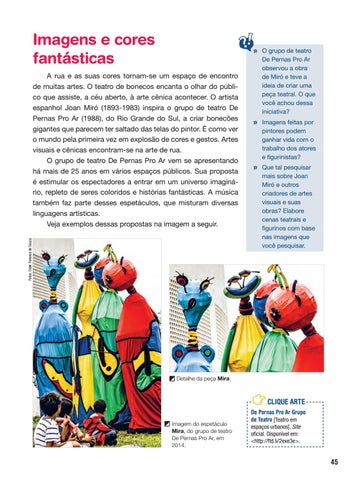 „„ O grupo de teatro De Pernas Pro Ar observou a obra de Miró e teve a ideia de criar uma peça teatral. O que você achou dessa iniciativa? „„ Imagens feitas por pintores podem ganhar vida com o trabalho dos atores e figurinistas? „„ Que tal pesquisar mais sobre Joan Miró e outros criadores de artes visuais e suas obras? Elabore cenas teatrais e figurinos com base nas imagens que você pesquisar.