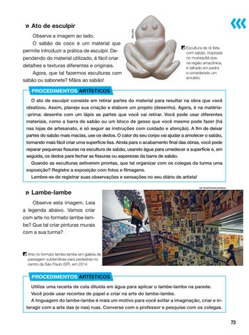 PROCEDIMENTOS ARTÍSTICOS O ato de esculpir consiste em retirar partes do material para resultar na obra que você idealizou. Assim, planeje sua criação e elabore um projeto (desenho). Agora, é na matéria-prima: desenhe com um lápis as partes que você vai retirar. Você pode usar diferentes materiais, como a barra de sabão ou um bloco de gesso que você mesmo pode fazer (há nas lojas de artesanato, é só seguir as instruções com cuidado e atenção). A fim de deixar partes do sabão mais macias, use os dedos. O calor do seu corpo vai ajudar a amolecer o sabão, tornando mais fácil criar uma superfície lisa. Ainda para o acabamento final das obras, você pode reparar pequenas fissuras na escultura de sabão, usando água para umedecer a superfície e, em seguida, os dedos para fechar as fissuras ou asperezas da barra de sabão. Quando as esculturas estiverem prontas, que tal organizar com os colegas da turma uma exposição? Registre a exposição com fotos e filmagens. Lembre-se de registrar suas observações e sensações no seu diário de artista!