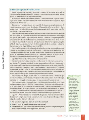 O etanol: um depressor do sistema nervoso Muitas propagandas procuram alimentar a imagem de bem-estar associada ao consumo de bebidas alcoólicas. No entanto, o efeito inverso também é parte integrante da ação do etanol no organismo humano. Há pessoas que apresentam baixa tolerância a bebidas alcoólicas e que estão mais sujeitas aos efeitos desagradáveis de curto prazo decorrentes de sua ingestão. O que explica essas diferenças? O etanol não é uma substância com papel de destaque no complexo sistema de reações que ocorrem no interior das células. O fígado o identifica como tóxico e libera uma enzima, a álcool desidrogenase (indicada pela sigla ADH), que o oxida, transformando-o em etanal – um aldeído. Quando uma pessoa ingere pequenas quantidades de etanol em um intervalo de tempo não muito curto, seu organismo é capaz de concluir essa transformação, que prossegue por ação de outra enzima, originando ácido etanoico. Esse ácido é um participante natural de nosso metabolismo. Mas isso requer tempo; assim, beber muito álcool de uma só vez pode causar problemas sérios – em alguns casos até a morte. Logo, o que explica o fato de algumas pessoas terem um nível elevado de tolerância ao álcool e outras não é a maior ou menor disponibilidade da enzima ADH. Entre os efeitos negativos imediatos do álcool, podemos citar: indisposição estomacal – decorrente do aldeído e do ácido formados – e sobrecarga do fígado e dos rins. O uso abusivo de etanol pode provocar dependência física e psicológica, problemas graves no sistema nervoso e predisposição a diferentes doenças no fígado, como a hepatite alcoólica e a cirrose, e no estômago, como a gastrite crônica. E qual é o efeito do etanol no sistema nervoso central? Tecnicamente, dizemos que o etanol é um depressor do sistema nervoso central, o que não significa que essa substância torne uma pessoa deprimida assim que começa a beber; na verdade, ela atua como redutor da atividade do sistema nervoso central. Por isso, os consumidores de álcool ficam mais “relaxados” e “autoconfiantes”. No Brasil, o motorista cometerá infração para qualquer quantidade (concentração) de etanol detectada no sangue. Caso apresente concentrações maiores que 6,0 decigramas de etanol por litro de sangue, o motorista responderá criminalmente. O etanol e outras drogas atuam sobre os neurotransmissores – moléculas que conectam uma célula nervosa (neurônio) a outra. Essas células são altamente especializadas na percepção e na elaboração de respostas a estímulos externos. Há neurotransmissores que estimulam a atividade elétrica do cérebro, isto é, são excitatórios, e outros – os inibitórios – que a reduzem. Assim, por exemplo, o aumento da quantidade de um neurotransmissor inibitório – o ácido gama-aminobutírico (GABA) – explica os movimentos lentos, típicos de alguém que se excedeu na bebida. O aumento da quantidade de outro neurotransmissor no sistema nervoso central – a dopamina – explica as sensações prazerosas experimentadas por quem bebe. Segundo o Ministério da Saúde, cerca de 12% das pessoas desenvolvem dependência do álcool em um processo lento, que comumente passa despercebido a quem bebe e àqueles que lhe são mais próximos. 1. Por que algumas pessoas são mais tolerantes ao álcool? 2. Qual é o efeito do etanol no sistema nervoso central? 3. O texto menciona que a dependência do álcool é um processo que passa despercebido a quem bebe e às pessoas próximas. Por quê?