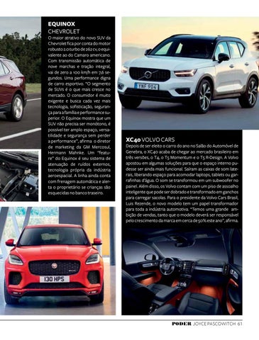 EQUINOX CHEVROLET O maior atrativo do novo SUV da Chevrolet fica por conta do motor robusto 2.0 turbo de 262 cv, o equivalente ao do Camaro americano. Com transmissão automática de nove marchas e tração integral, vai de zero a 100 km/h em 7,6 segundos. Uma performance digna de carro esportivo. “O segmento de SUVs é o que mais cresce no mercado. O consumidor é muito exigente e busca cada vez mais tecnologia, sofisticação, segurança para a família e performance superior. O Equinox mostra que um SUV não precisa ser monótono, é possível ter amplo espaço, versatilidade e segurança sem perder a performance”, afirma o diretor de marketing da GM Mercosul, Hermann Mahnke. Um “feature” do Equinox é seu sistema de atenuação de ruídos externos, tecnologia própria da indústria aeroespacial. A linha ainda conta com frenagem automática e alerta o proprietário se crianças são esquecidas no banco traseiro.