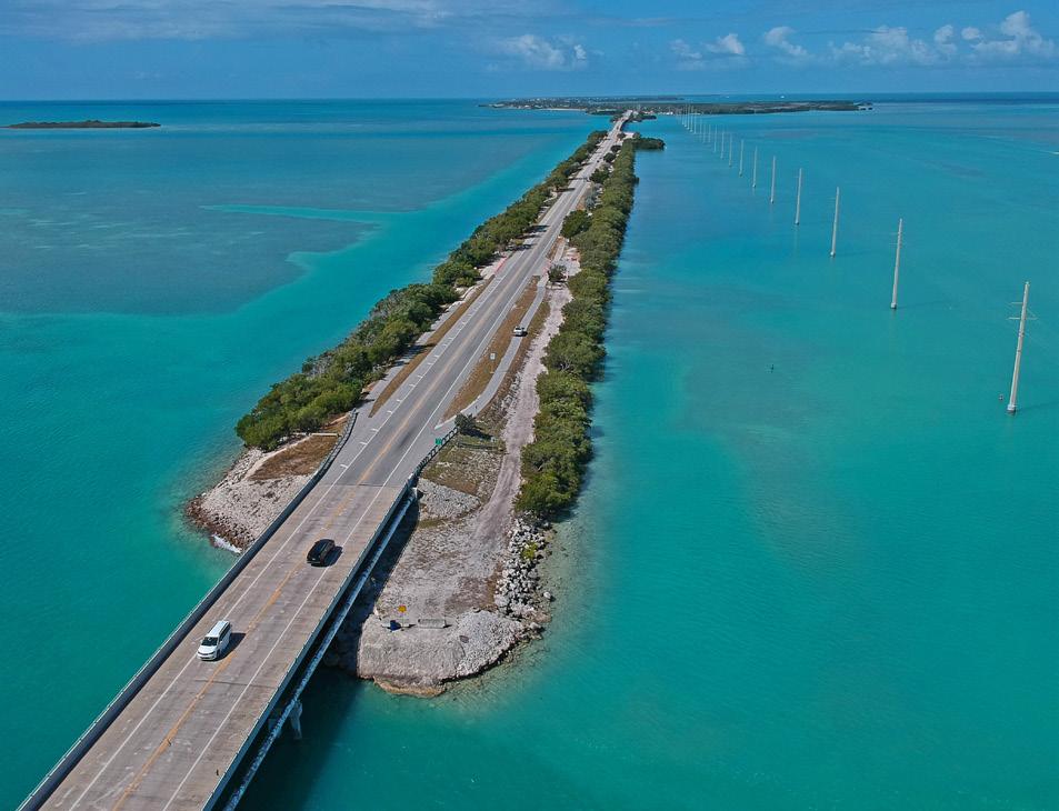 Na região das Florida Keys, próxima a miami, os visitantes podem desfrutar de uma viagem singular, atravessando mais de 100 ilhas por uma estrada repleta de vistas espetaculares do mar, ligadas por mais de 40 pontes.