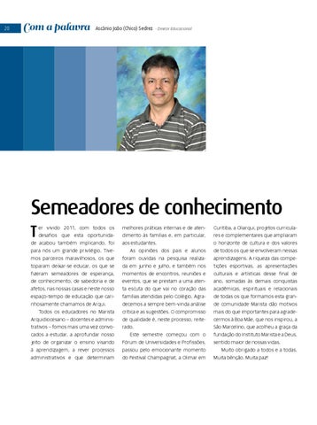 er vivido 2011, com todos os desafios que esta oportunidade acabou também implicando, foi para nós um grande privilégio. Tivemos parceiros maravilhosos, os que toparam deixar-se educar, os que se fizeram semeadores de esperança, de conhecimento, de sabedoria e de afetos, nas nossas casas e neste nosso espaço-tempo de educação que carinhosamente chamamos de Arqui. Todos os educadores no Marista Arquidiocesano – docentes e administrativos – fomos mais uma vez convocados a estudar, a aprofundar nosso jeito de organizar o ensino visando à aprendizagem, a rever processos administrativos e que determinam