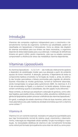 Vitaminas Lipossolúveis As vitaminas lipossolúveis − A, D, E e K − são moléculas relativamente apolares e dependem de solubilização micelar para sua absorção a partir do ambiente aquoso do lúmen intestinal. A absorção, portanto, é dependente de todos os componentes lipídicos envolvidos na formação da micela e, ainda, do estímulo das funções pancreáticas e biliares promovidas pela ingestão do alimento. Quando misturadas às micelas gordurosas, tornam-se facilmente absorvidas, sendo transportadas no sangue pelos quilomícrons (QM). As vitaminas A, D e K são armazenadas no fígado, e a vitamina E no tecido adiposo. Embora apresentem semelhança quanto à solubilidade, elas têm papéis muito diferentes.1 Nesse contexto, as doenças que prejudicam a absorção de gorduras, como colestase hepática, pancreatite crônica, enterites e colites, alcoolismo e deficiência congênita de lipoproteínas podem provocar a deficiência das vitaminas lipossolúveis.1 Em geral, a avaliação do estado vitamínico é feita de duas maneiras: pelos seus níveis plasmáticos e/ou pela medida da atividade enzimática que tem a vitamina como cofator.1,2